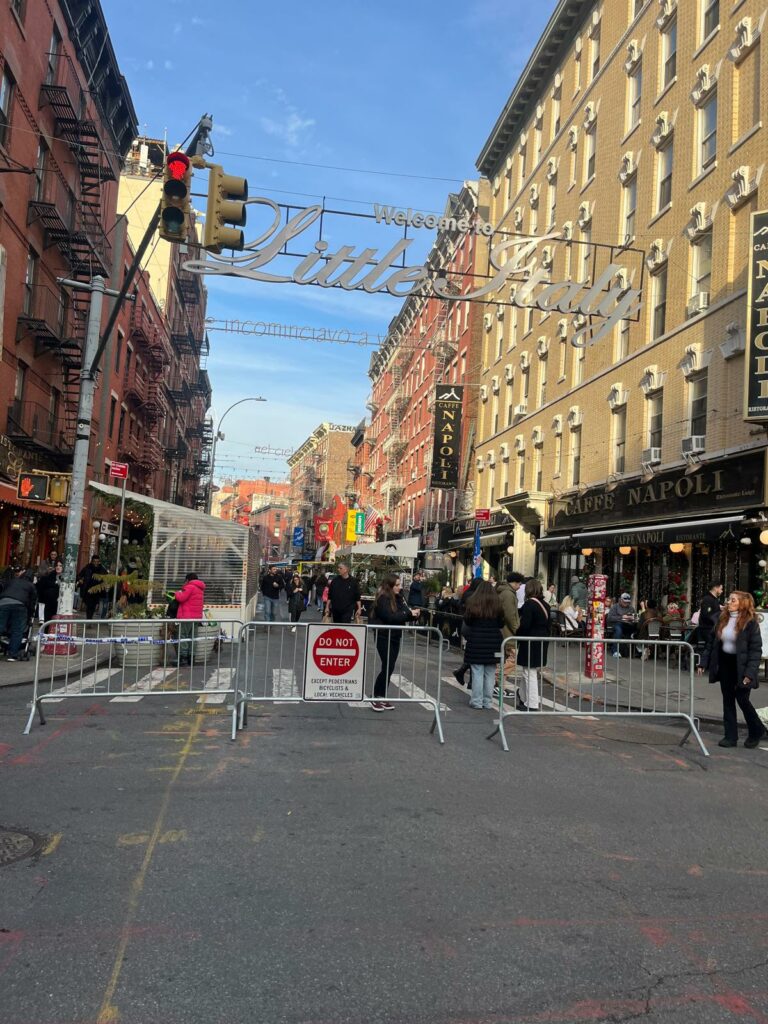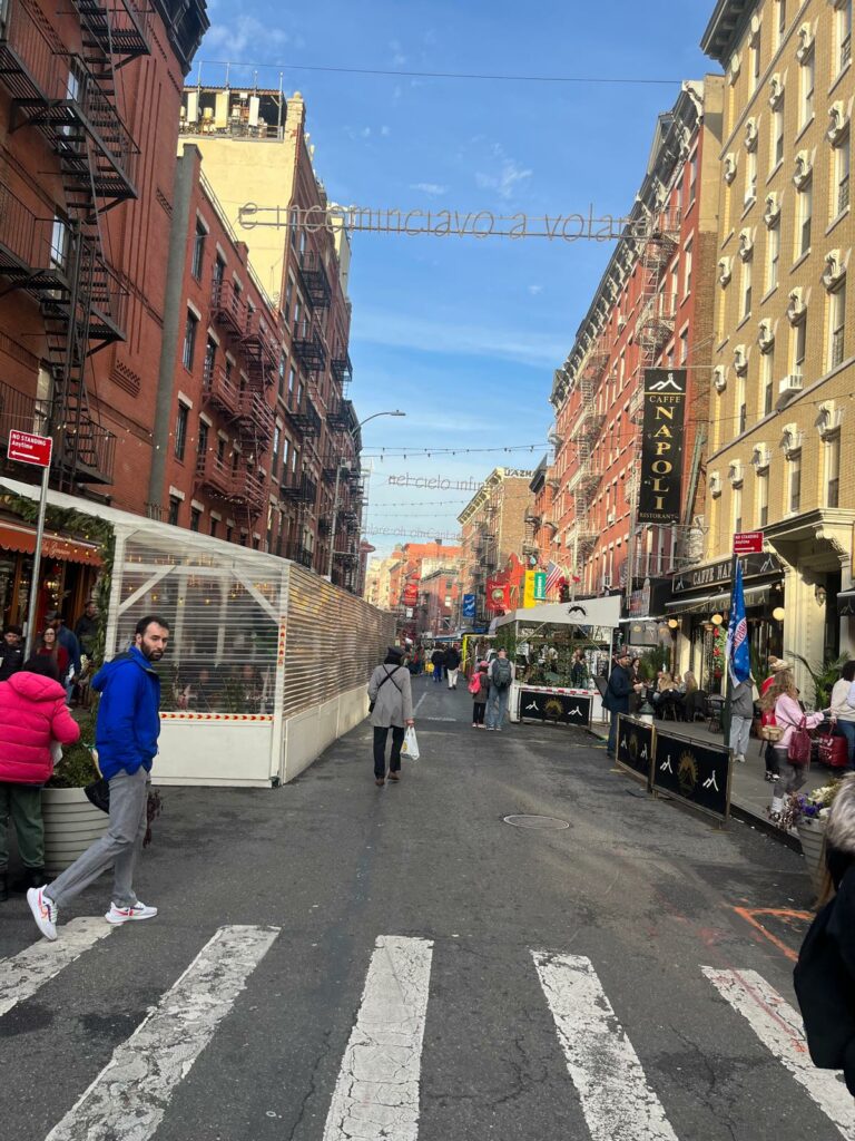 A little Italy, rendez-vous à Mulberry Street. Cette artère historique conserve son charme d’antan avec ses façades colorées, ses terrasses de restaurants et l’animation constante de ses commerçants.